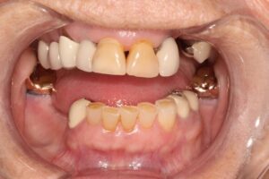 Restored upper teeth with a bridge that had attachments for a new, more aesthetically pleasing partial. Restored worn lower teeth with crowns; replaced missing teeth with implants.