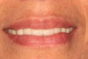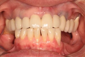 Rosaura had always hated her partial denture and was quite interested in implants. She also had some teeth that were fractured due to old root canal treatments. Rosaura had been told she did not have enough bone for implants, but 3D imaging revealed that was not the case. Replaced failing crowns with new ones and replaced missing teeth with implants.