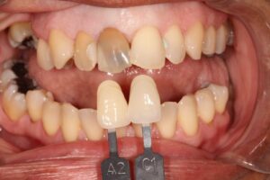 One custom-shaded crown to match the other teeth perfectly due to a discolored tooth she had.