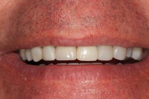 Crowns in the front were breaking, and a lower molar hurt to bite on. The cause was that the bite was “off.” Remade all the upper crowns, which corrected the bite and also relieved the painful molar issue.